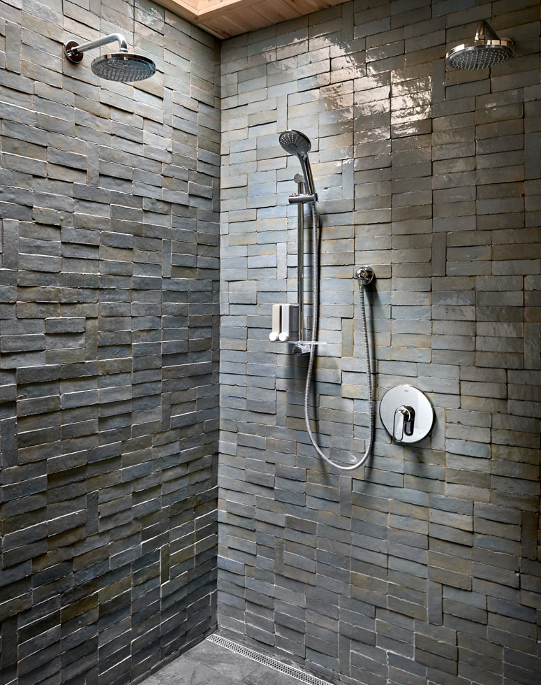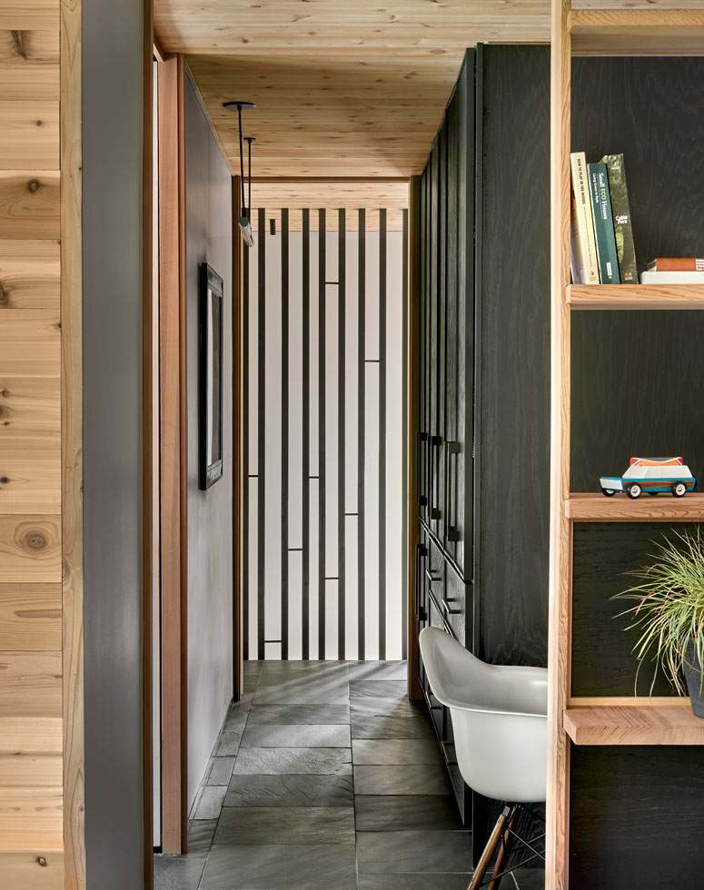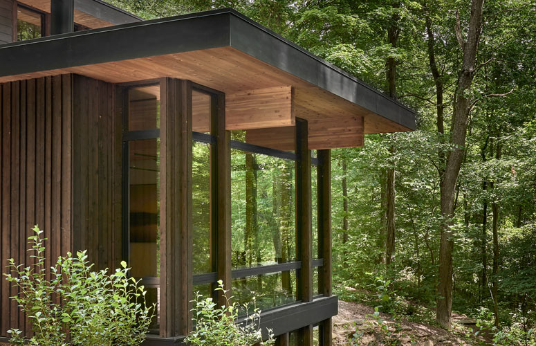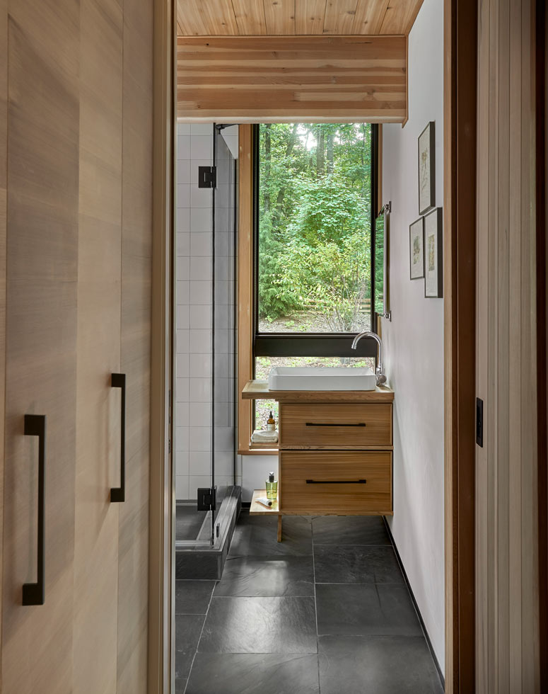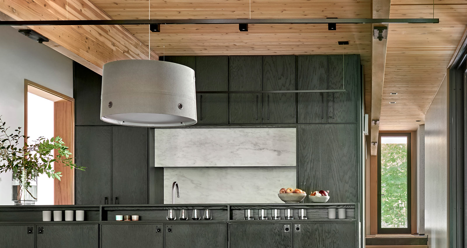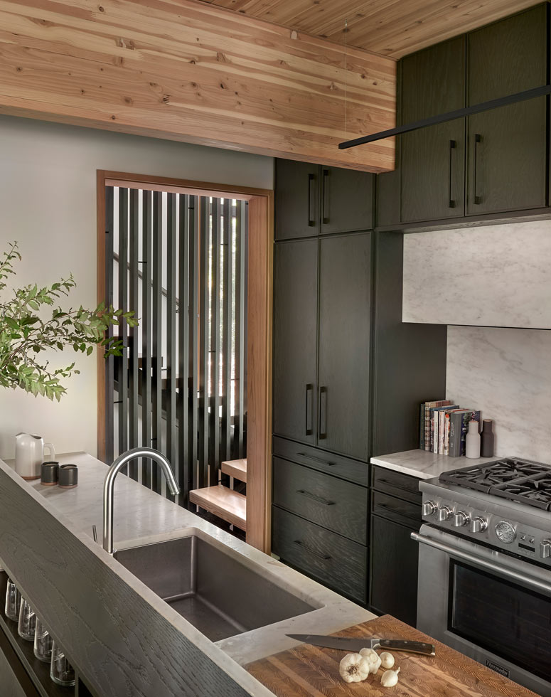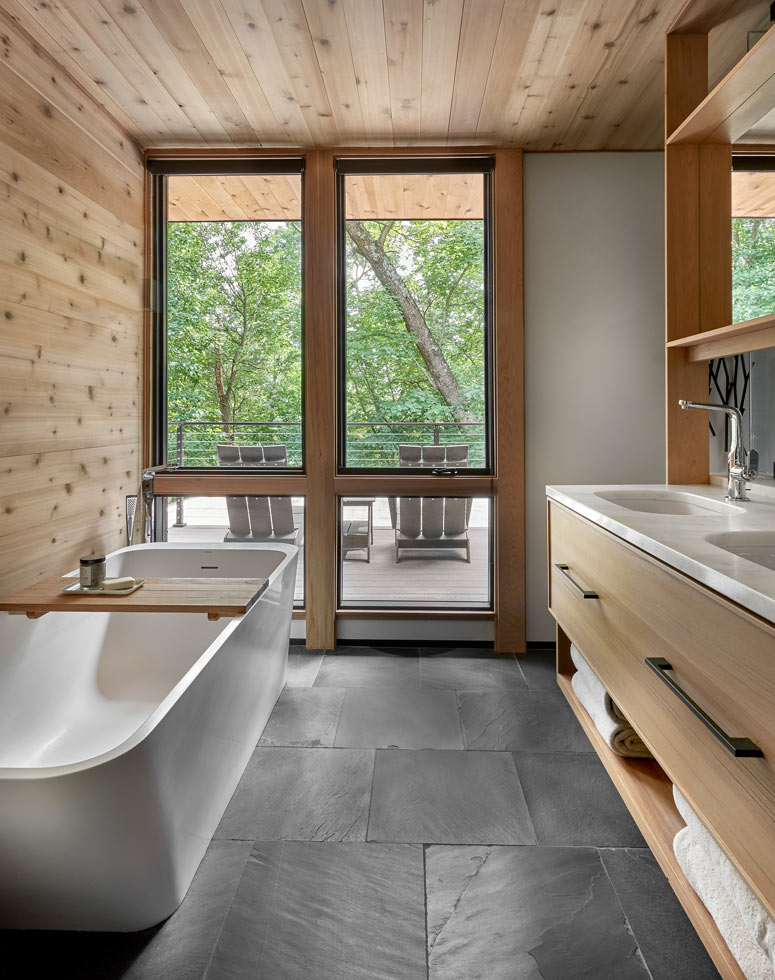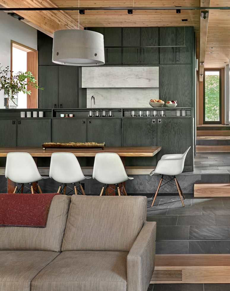 Warm wood ceilings and steps combine with natural black slate floors as the house progresses from the kitchen to the living room, with its expansive view of the woods. The minimalist Cirrus lighting system casts a warm glow throughout the home without drawing attention to the fixtures themselves. They blend into the modern architecture of the interior design, sleek lines that further accentuate the geometry and flow from space to space.
