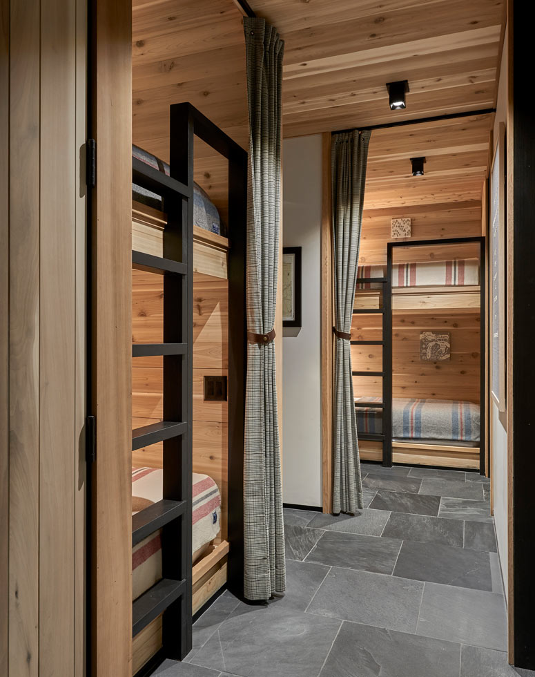 Untreated cedar brings rustic consistency to the walls and ceilings throughout the home, exuding warmth and comfort in every room. The hand-worked blackened steel fireplaces stand in beautiful contrast, creating a look simultaneously organic and modern.