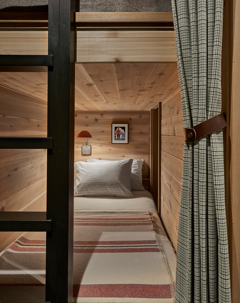 The house feels spacious, but is actually very compact. There's not a square inch of wasted space to be found. The lower level stylishly houses two pairs of bunk beds and a murphy bed to comfortably accommodate plenty of guests. Again, the lighting is understated enough to not draw attention, but perfectly coordinated to bathe the warm wood walls in cozy light.