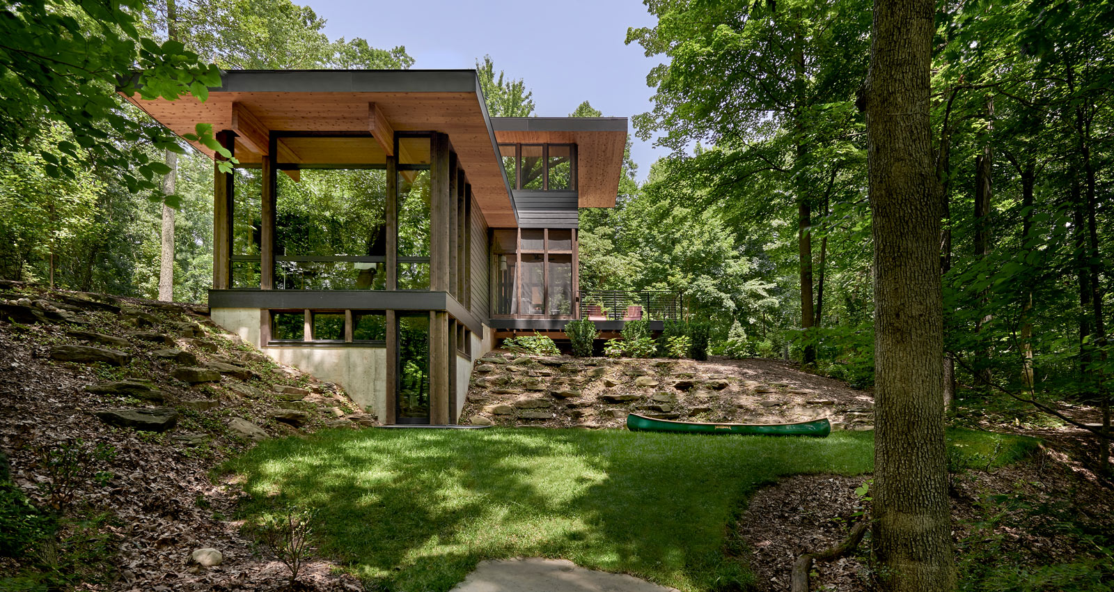 Natural materials and panoramic views make this woodsy, modern cottage the perfect weekend getaway from the hustle and bustle of nearby Chicago. Lovingly realized by Searl Lamaster Howe Architects and captured by photographer Tony Soluri, step inside this stunning home nestled along the edge of a state park in central Michigan.